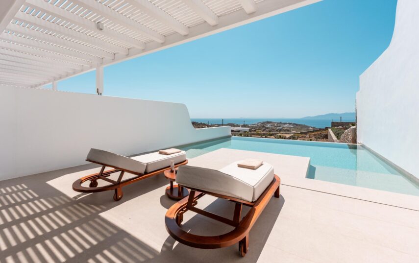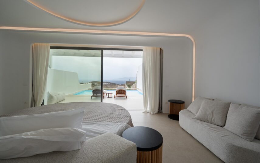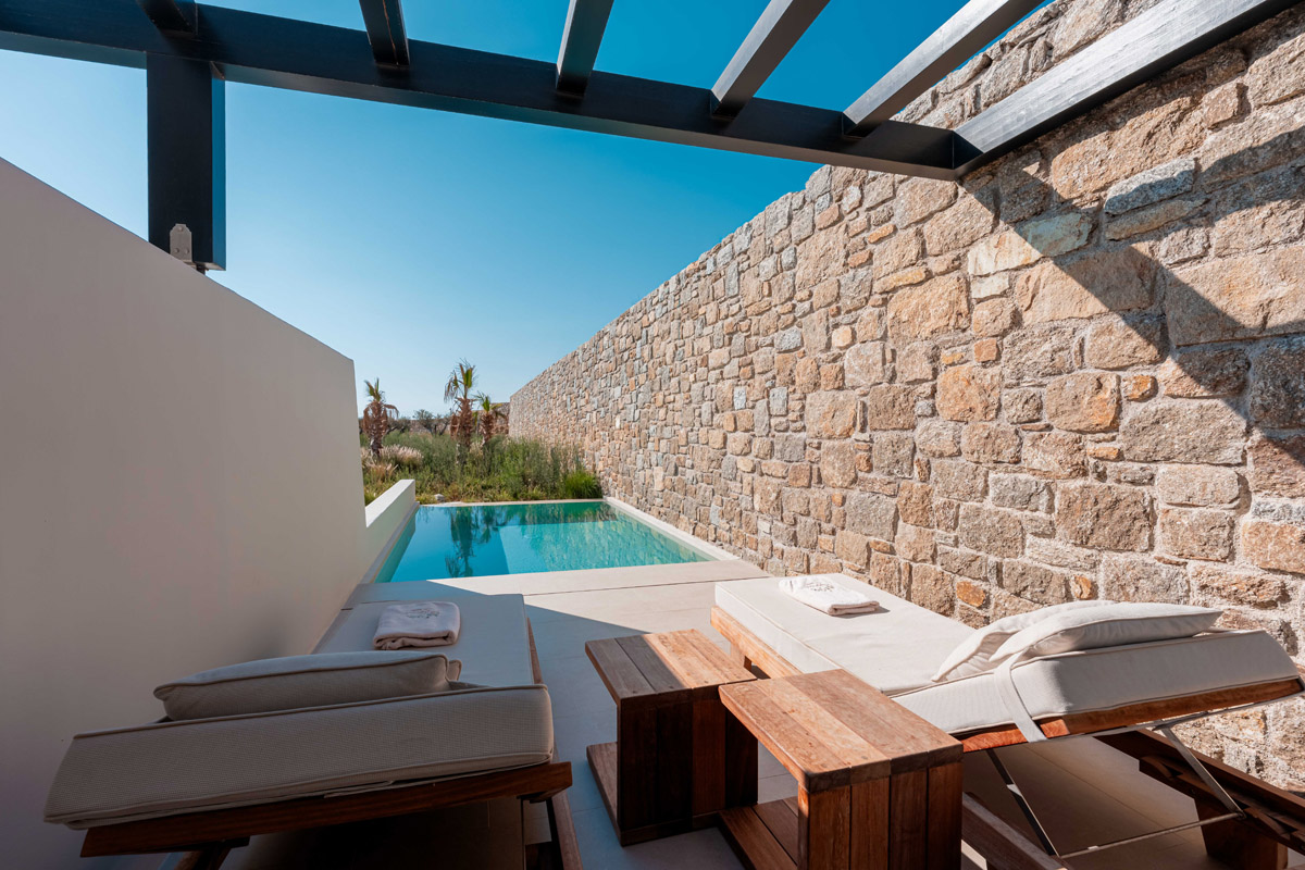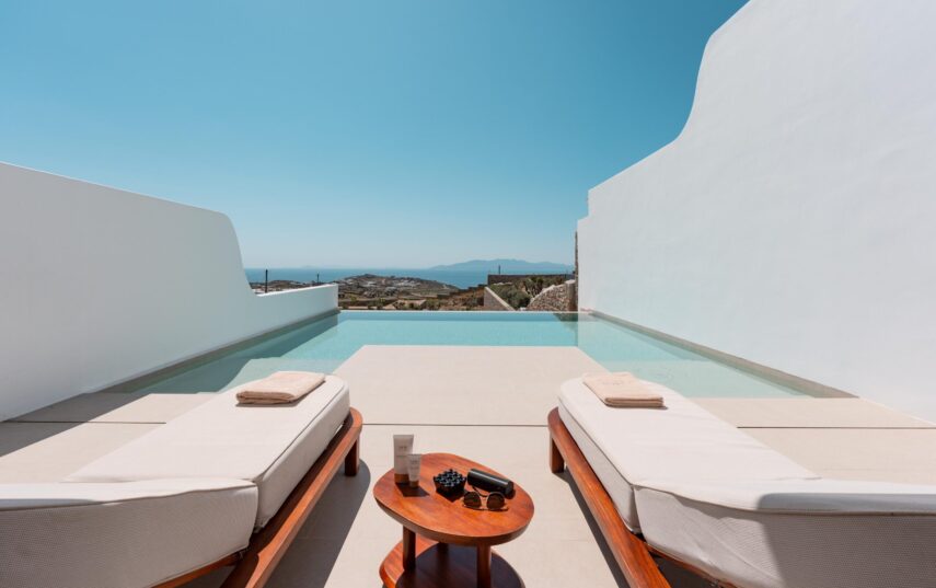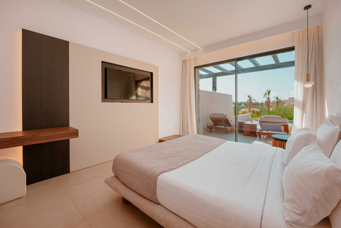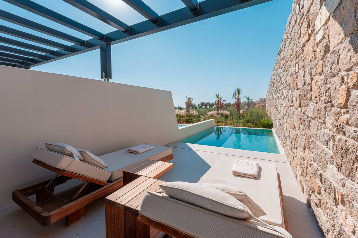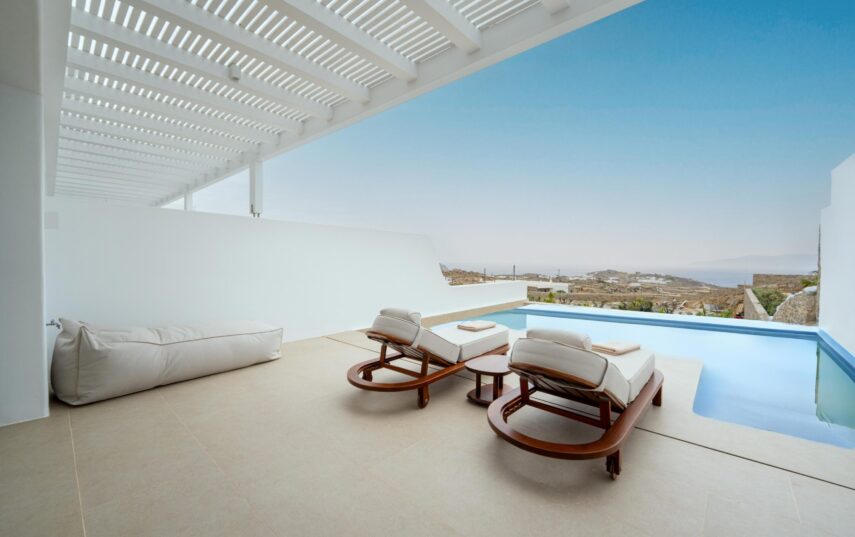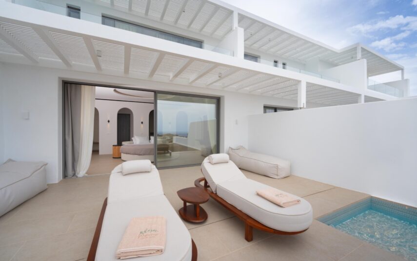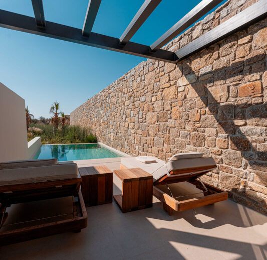 “Step into a world of refined elegance in our Deluxe Suite at Muse of Mykonos. This luxurious retreat features a king-size bed, an en suite bathroom with a rain shower and a private pool set on a spacious terrace with sunbeds, a large LCD TV, a table and chairs, all overlooking a serene garden view. ”