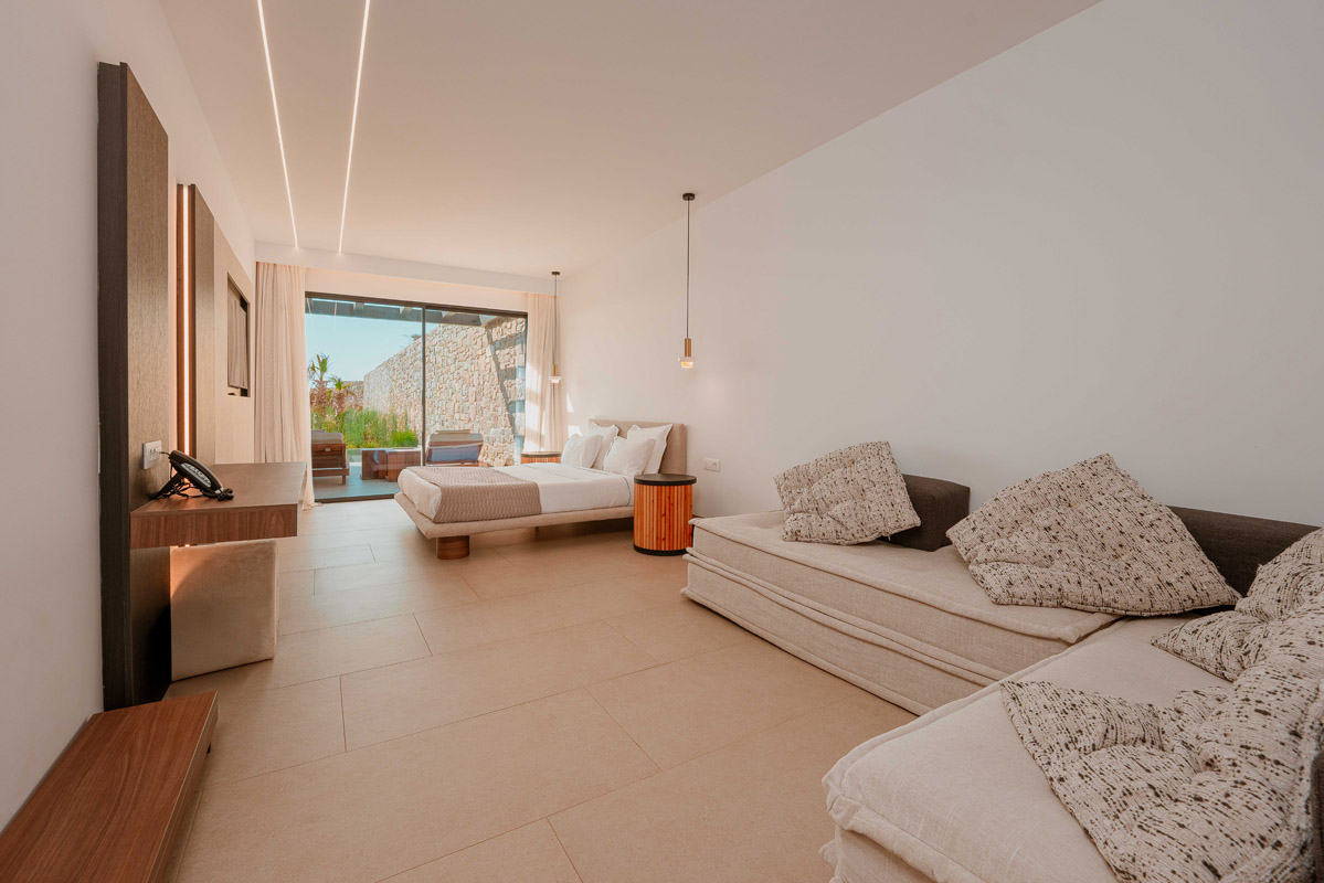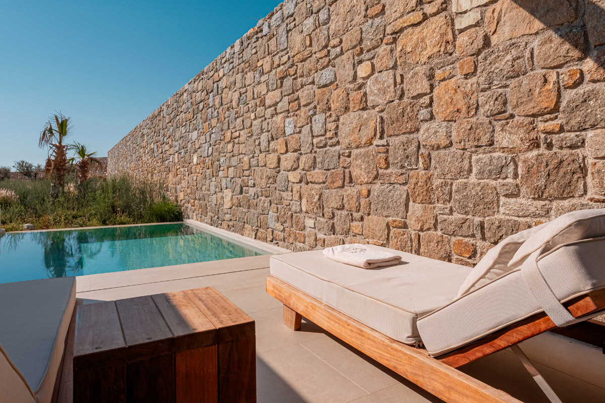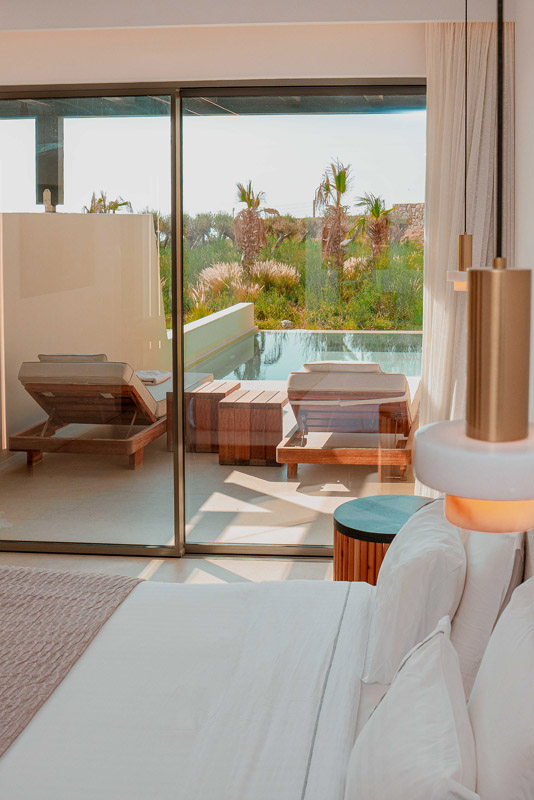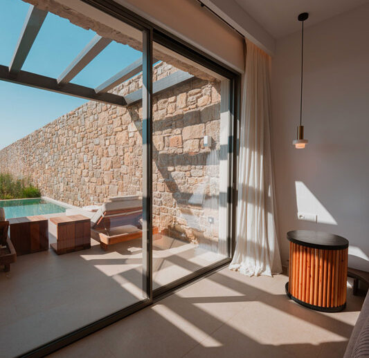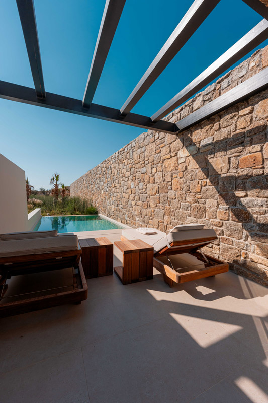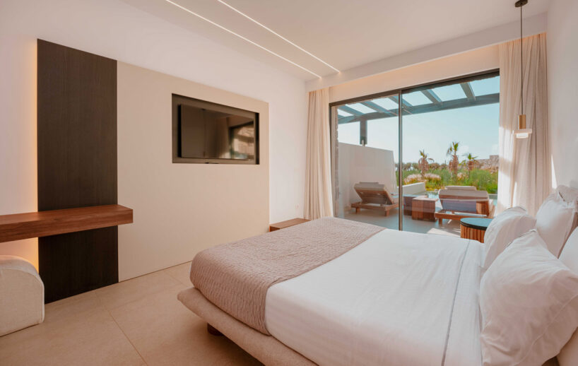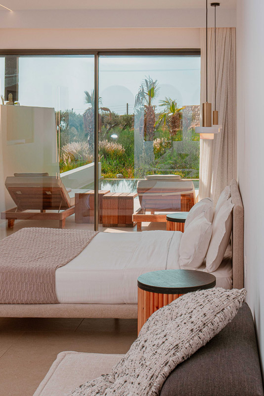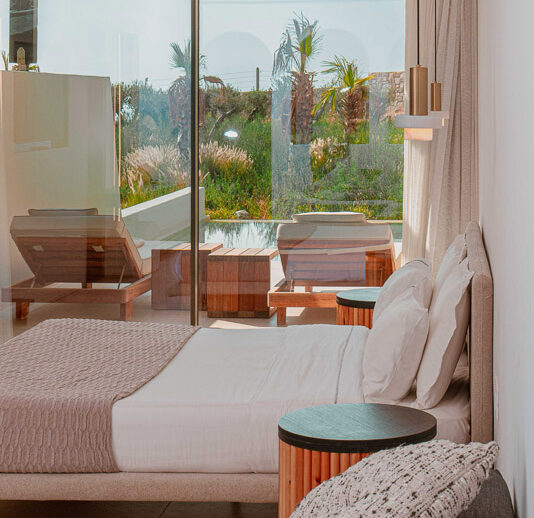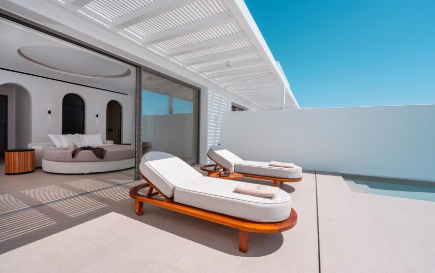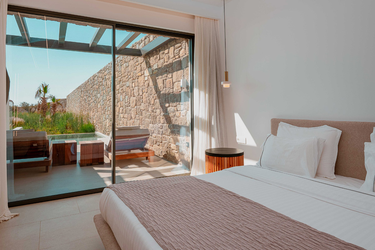 “Step into a world of refined elegance in our Deluxe Suite at Muse of Mykonos. This luxurious retreat features a king-size bed, an en suite bathroom with a rain shower and a private pool set on a spacious terrace with sunbeds, a large LCD TV, a table and chairs, all overlooking a serene garden view. ”