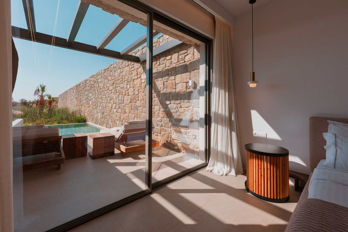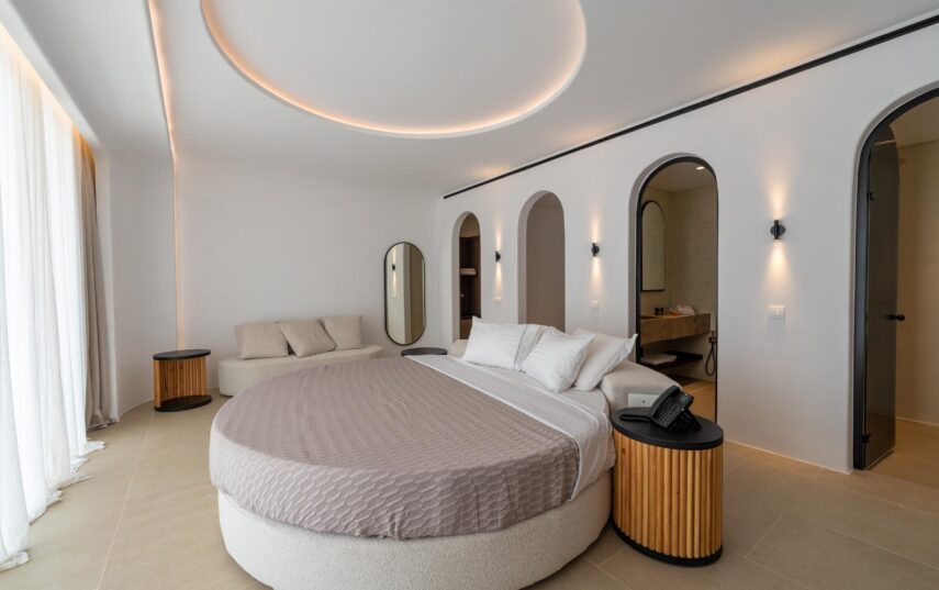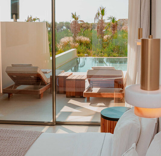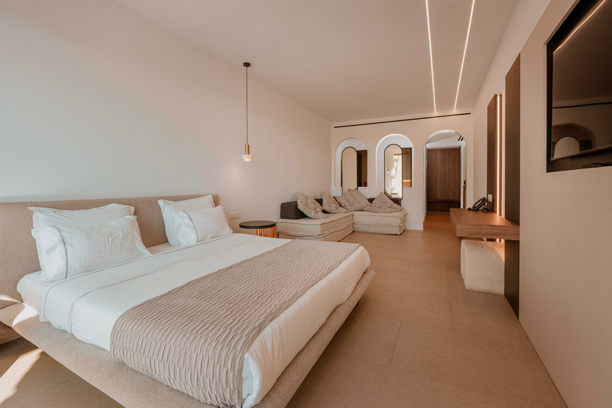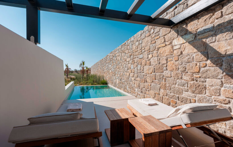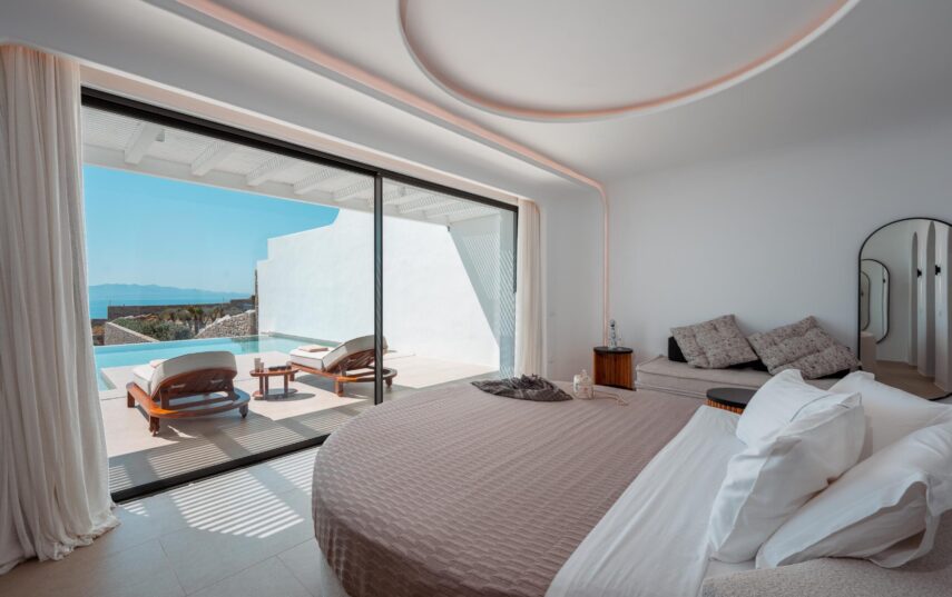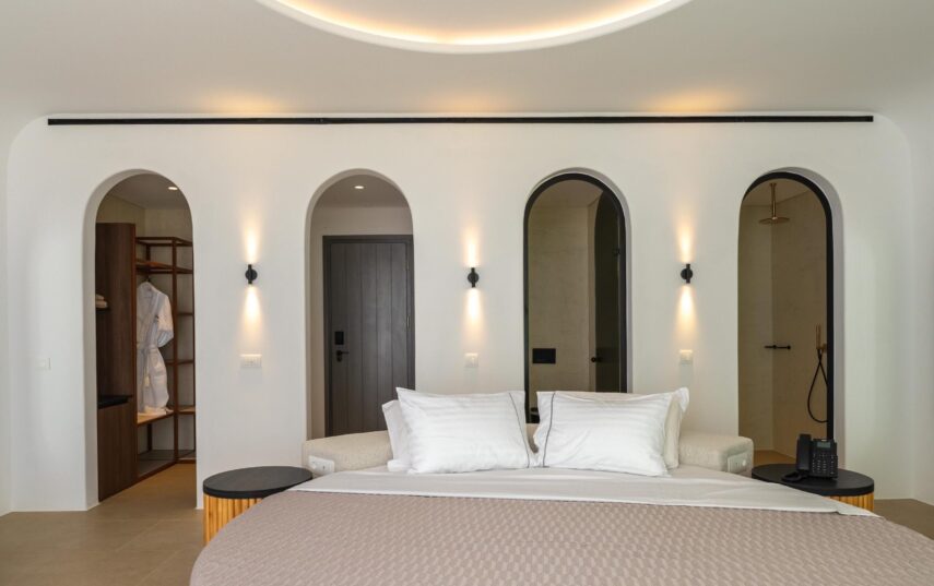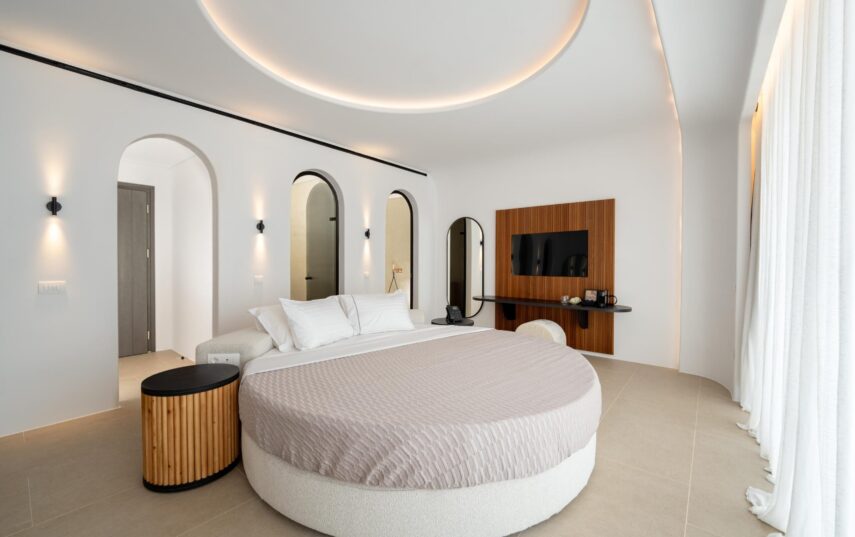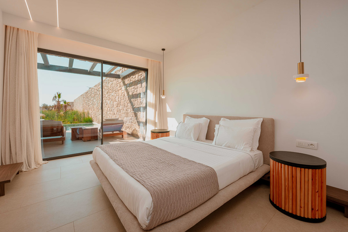 “Step into a world of refined elegance in our Deluxe Suite at Muse of Mykonos. This luxurious retreat features a king-size bed, an en suite bathroom with a rain shower and a private pool set on a spacious terrace with sunbeds, a large LCD TV, a table and chairs, all overlooking a serene garden view. ”
