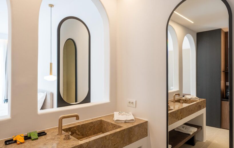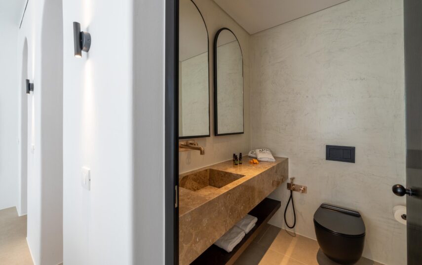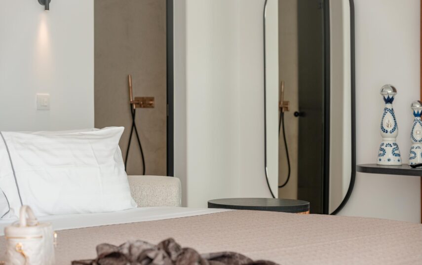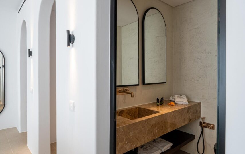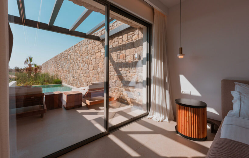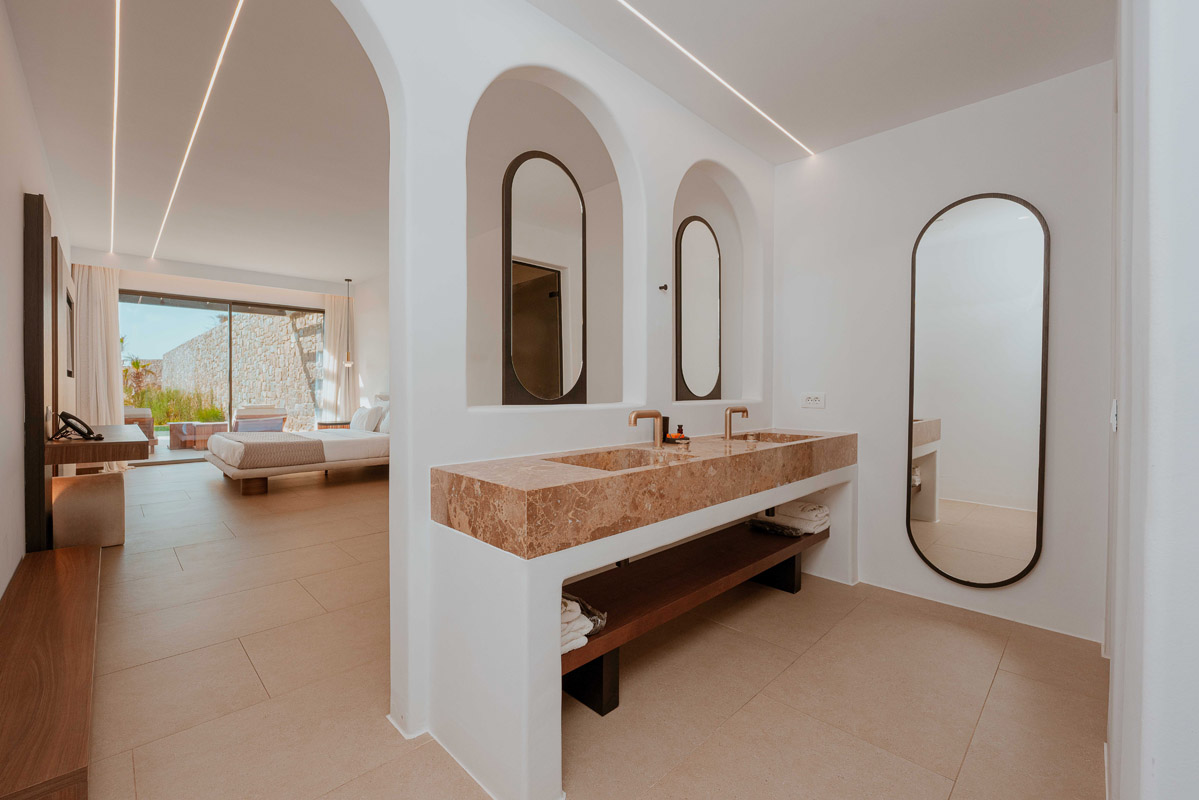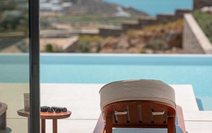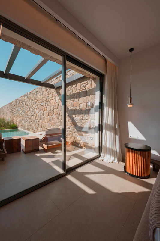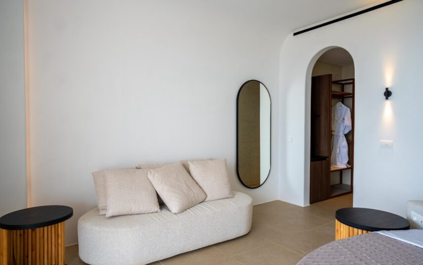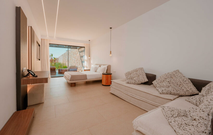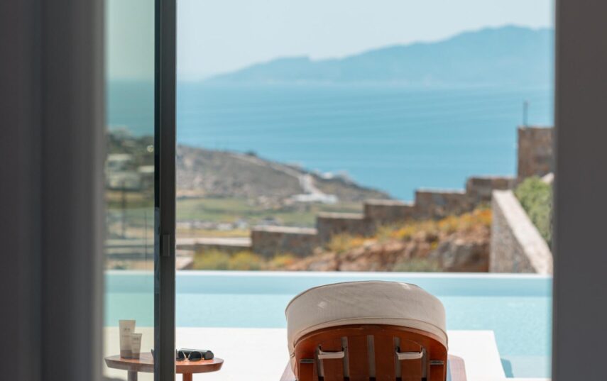 “Step into a world of refined elegance in our Deluxe Suite at Muse of Mykonos. This luxurious retreat features a king-size bed, an en suite bathroom with a rain shower and a private pool set on a spacious terrace with sunbeds, a large LCD TV, a table and chairs, all overlooking a serene garden view. ”